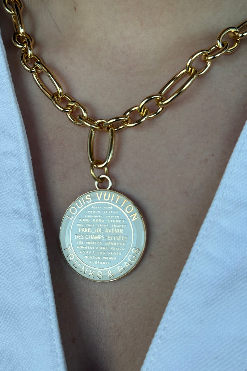 Authentic vintage logo charm repurposed into the most beautiful bold necklace.