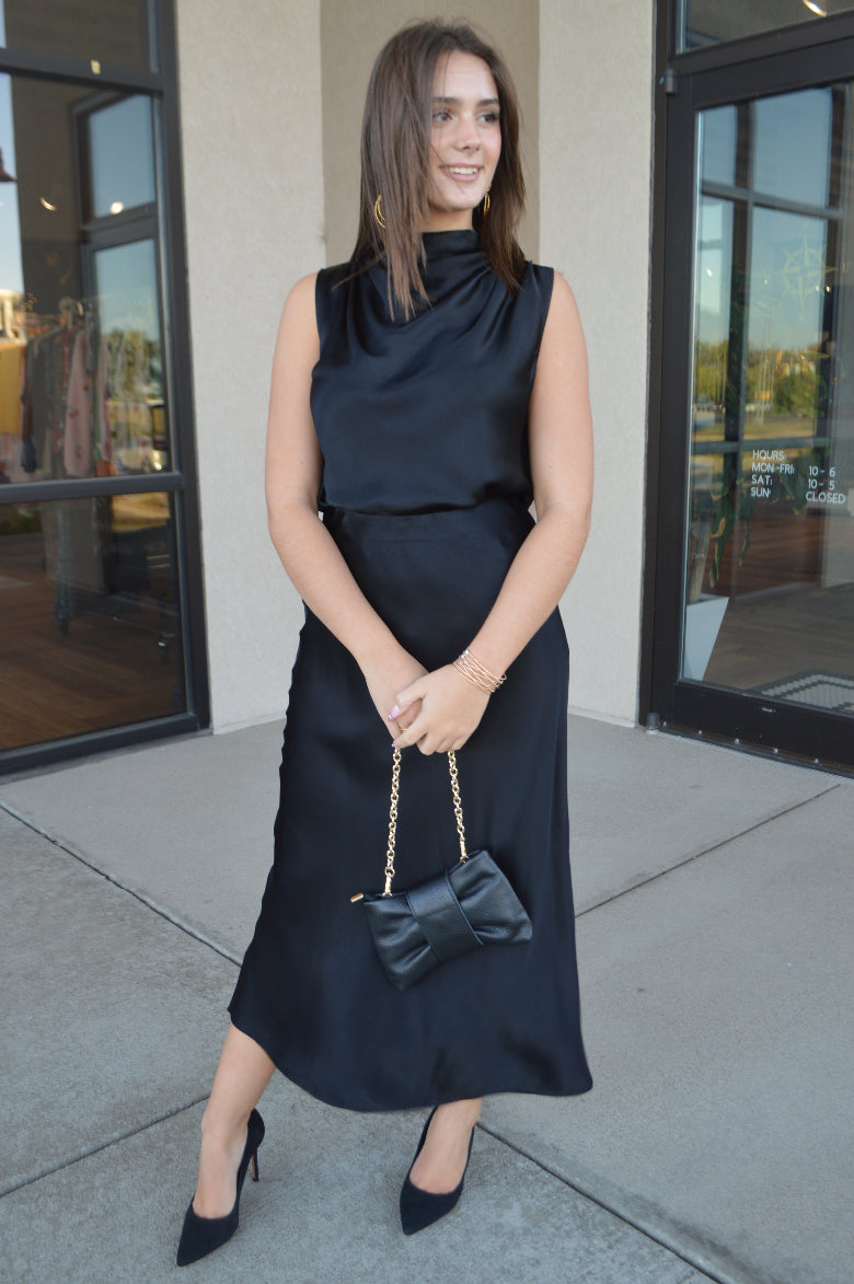 The Kaleen Top is a contemporary tank crafted from smooth, satin back crepe. It features a draped mock neck and fluid silhouette with a traditional camisole fit.