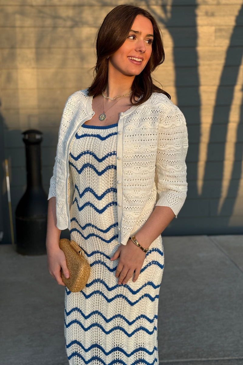 The Tessa Cardigan showcases refined craftsmanship with delicate scalloped edges that frame the neck, waist and arm opening with understated elegance. Covered buttons add a polished, cohesive finish, while an intricate multi-stitch pattern creates visual depth and texture throughout. This thoughtfully designed piece balances feminine details with timeless sophistication, making it an essential layer for elevated everyday styling.
