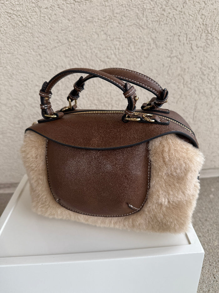 LUNA’s eye-catching mixed media exterior combines cozy sherpa with brown leather details. Her neutral color palette and detachable crossbody make this fashion-forward handbag an extra versatile addition to your chilly weather wardrobe.