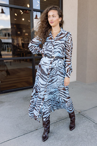 Unleash your wild side with the Aria Dress! This stunning dress features a playful blue and brown zebra print, a classic collared neckline, and a button front for effortless style. Stand out from the crowd and make a statement with this bold and beautiful dress.