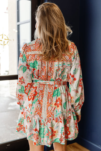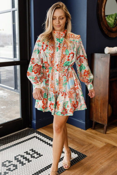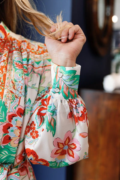 Daria is classicly flirty with an air of tropic fun. The gorgeous scarf print takes the classic shirt dress to the next level.