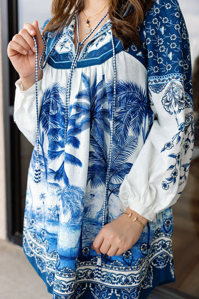 Embrace the essence of tropical beauty with the Off-White Palm Tree Beach Mini Dress. Crafted from responsible materials, this delightful piece showcases intricate palm tree patterns in serene blues and whites. The round neckline and billowy sleeves add a playful touch, while the relaxed fit ensures comfort. Perfect for sun-soaked days, this dress brings a refreshing breeze of style to your wardrobe. LENZING™ ECOVERO™: the eco-responsible fibers generate up to 50% lower emissions and water impact compared to generic viscose.