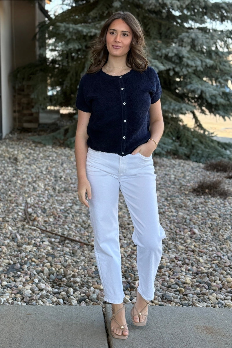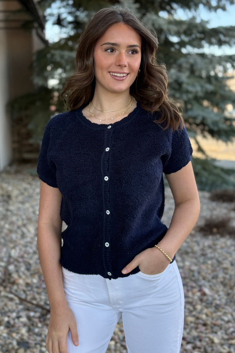 The Olivia Button Down Sweater combines textured bouclé terry with refined tailoring for effortless spring layering. Delicate scalloped edges add a subtle feminine touch, while the button-front design offers versatile styling options. Transition seamlessly from casual denim looks to polished skirt pairings. This mid-weight knit delivers both comfort and sophistication, making it an essential piece for your seasonal wardrobe rotation.
