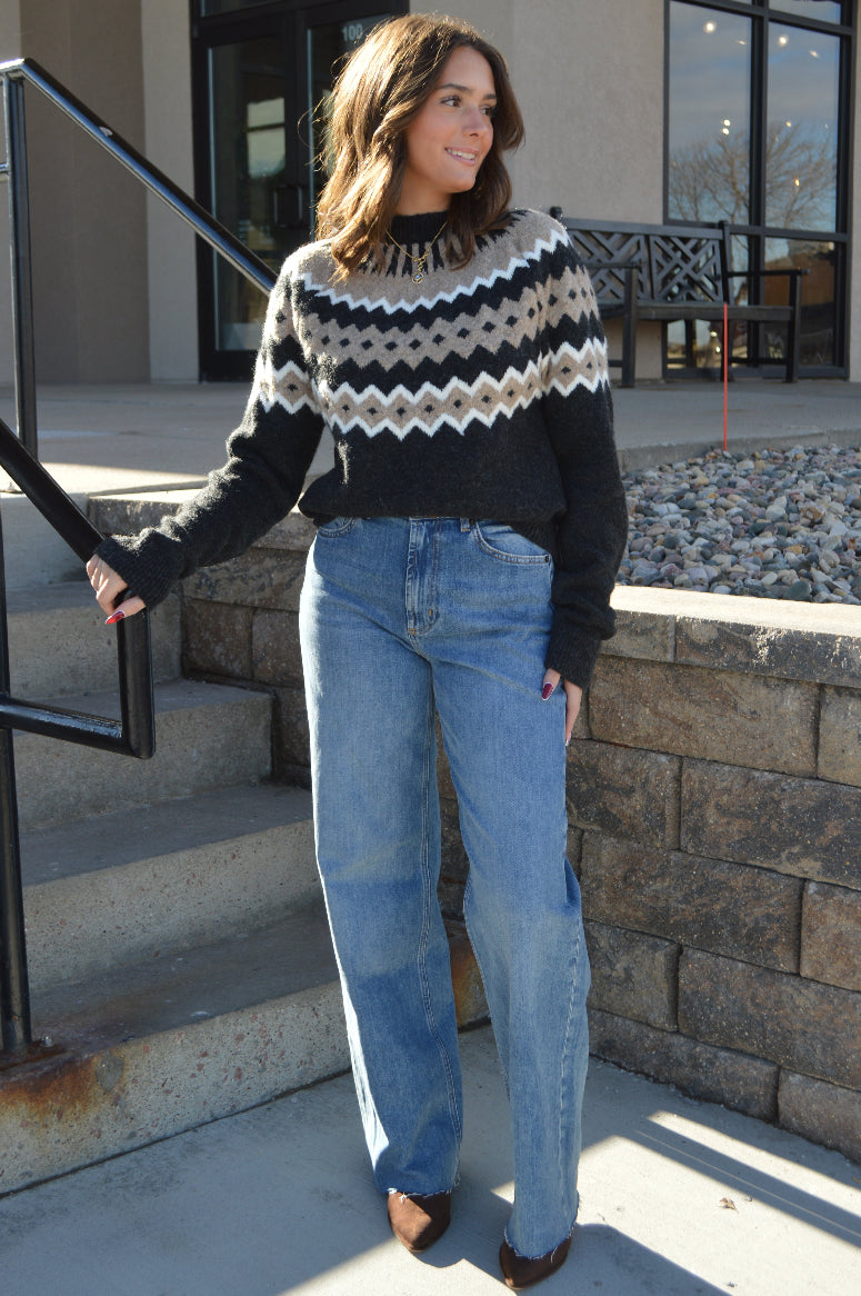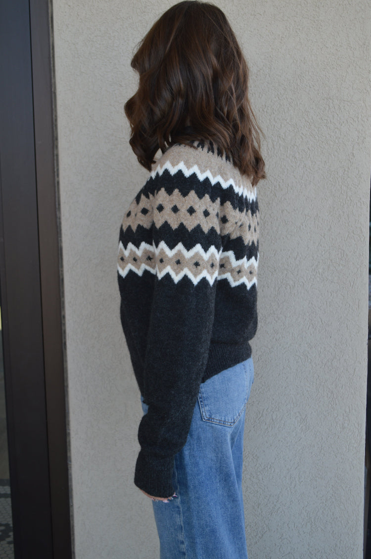 The classic fair isle sweater is given a modern twist in this charcoal & taupe mixed stitch. The Adrian sweater is super cozy in a soft yarn that is perfect for winter.