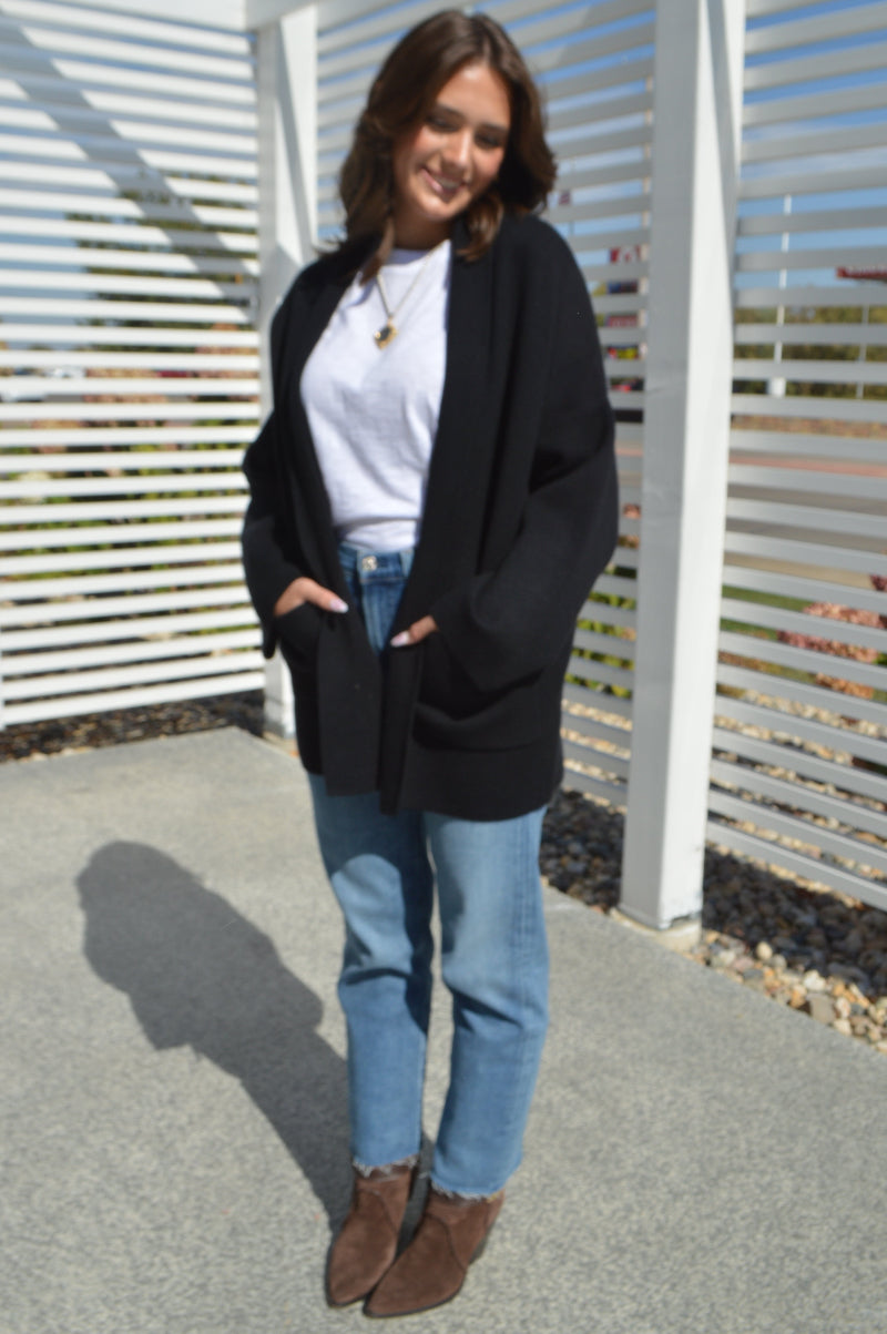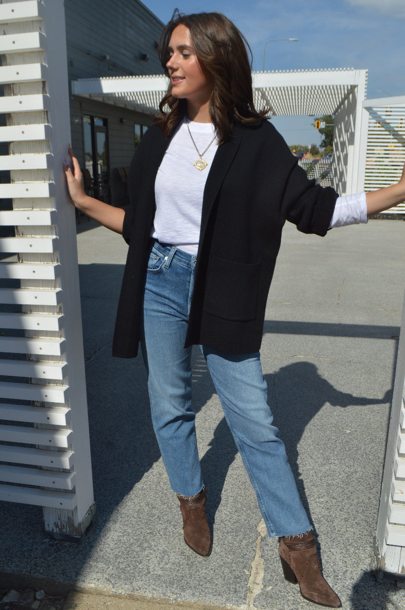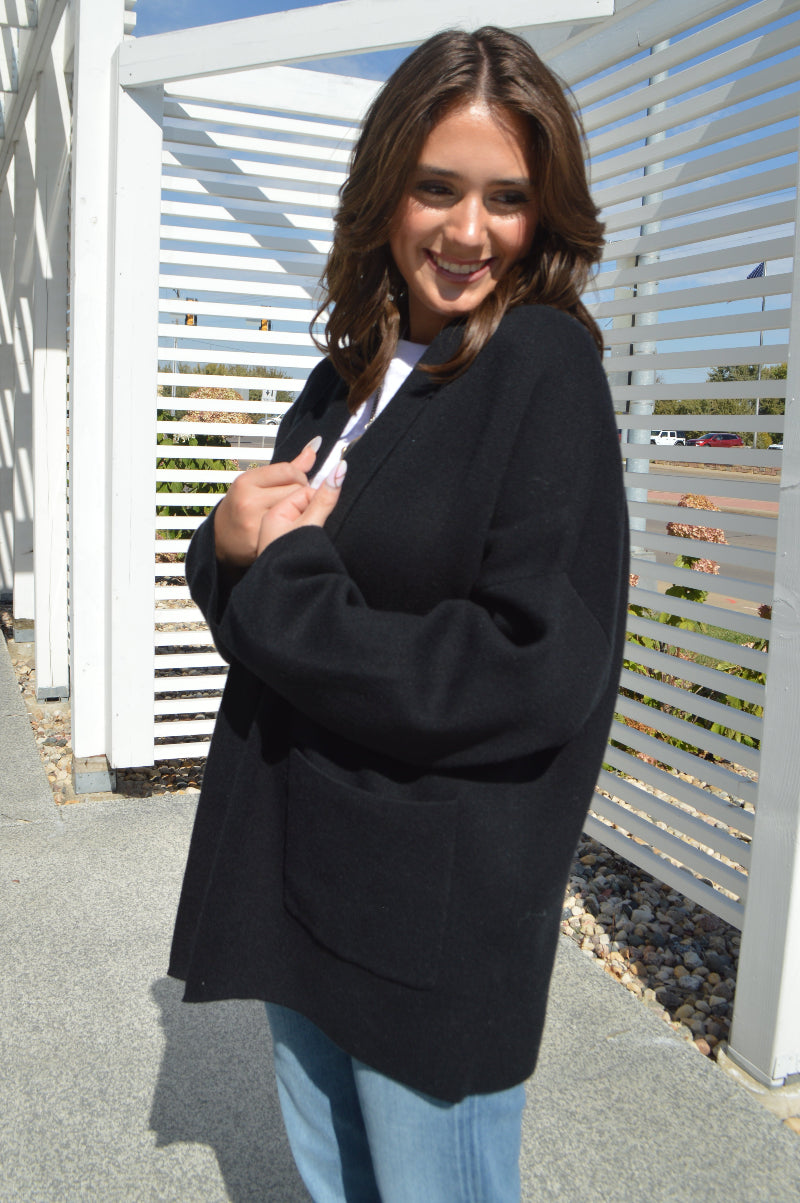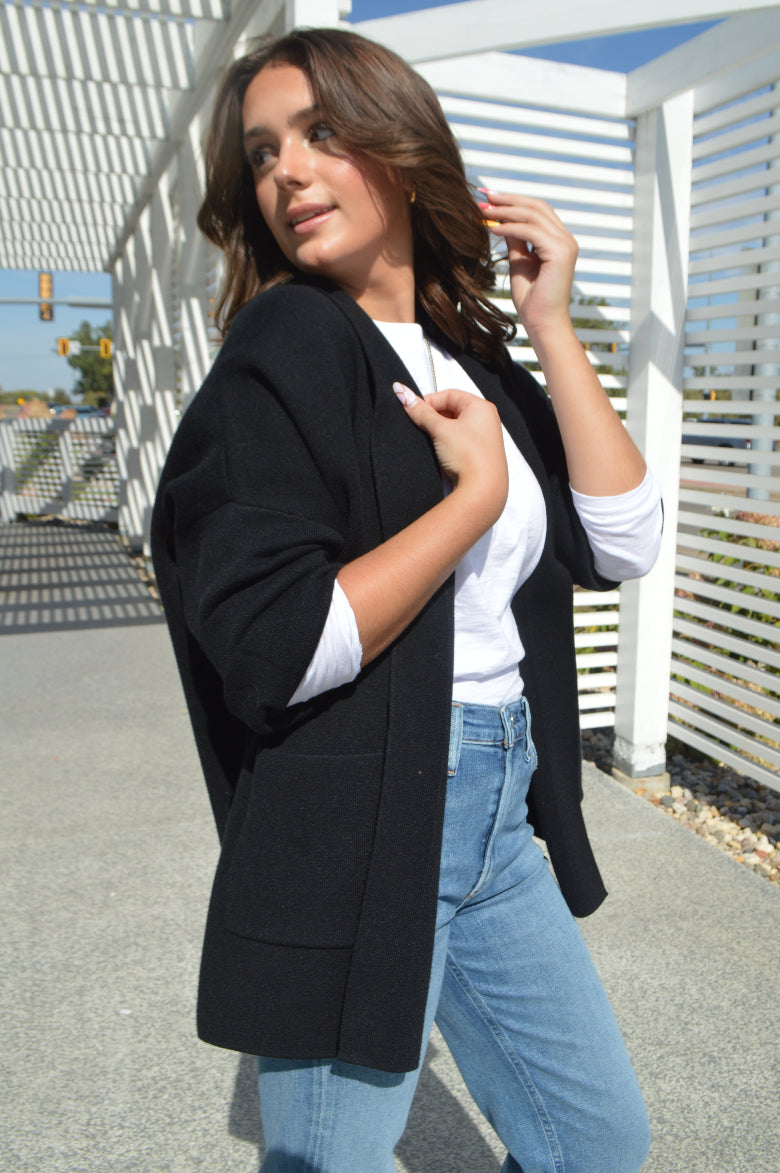 The perfect layer for colder weather.  Emily is stylish and comfortable with a boxy, loose fit and patch pockets.