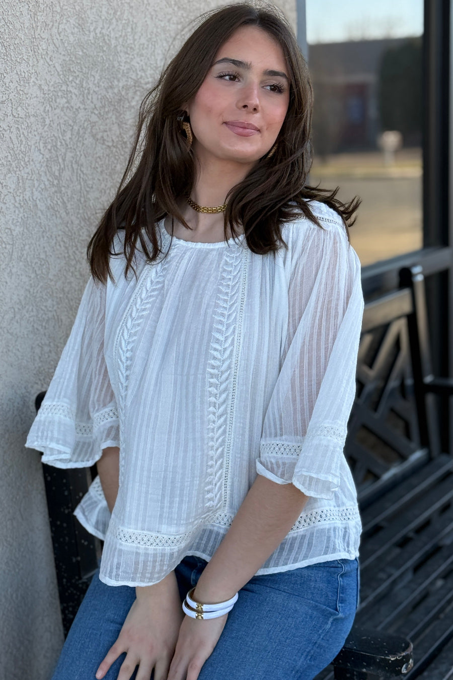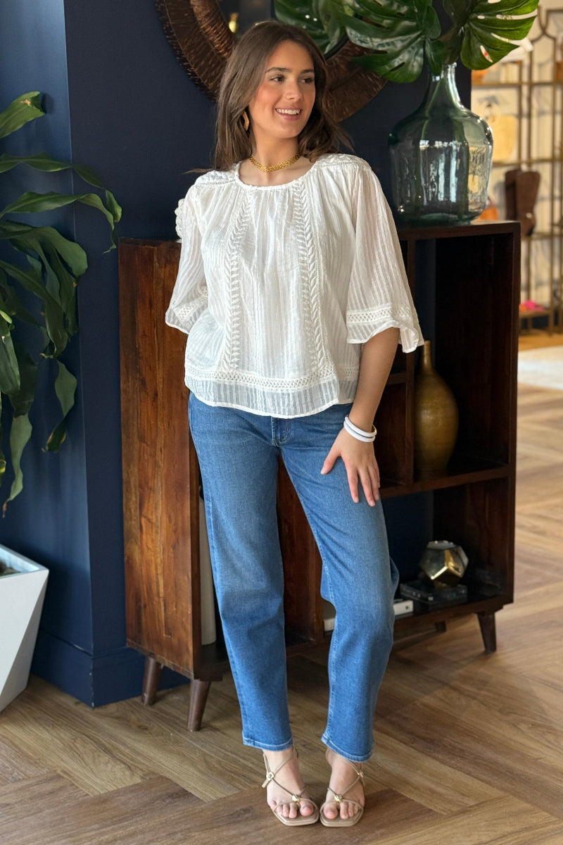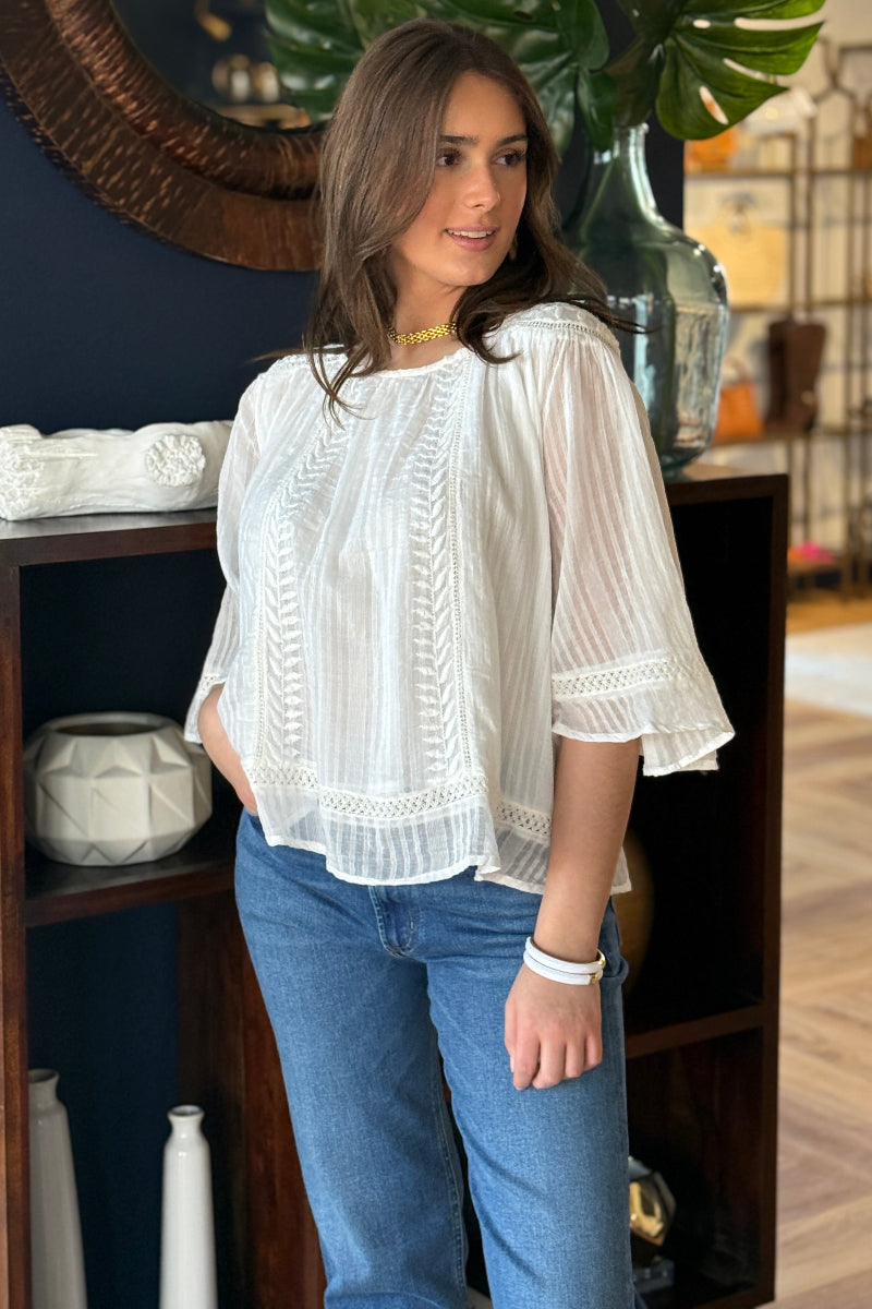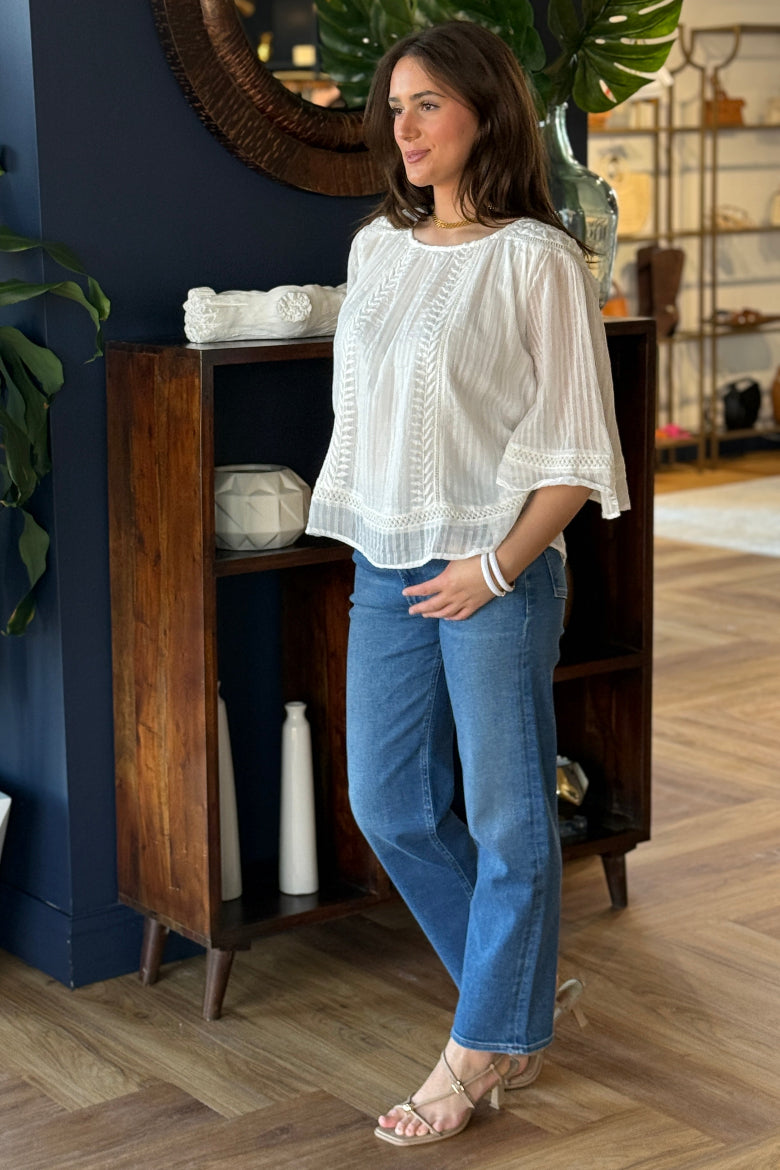 The Laney Top is a soft, flowy silhouette with delicate embroidered details at the shoulders and down the center as well as crochet trims that give it a romantic, feminine feel. Lightweight and airy, it’s the perfect piece to dress up your everyday look without trying too hard. Timeless, effortless, and quietly statement-making — this is not your average white blouse.