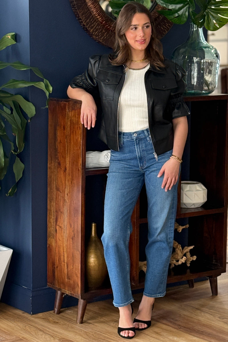 Upgrade your wardrobe with our Vegan Leather Short Sleeve Double Zip Jacket. Crafted from luxurious faux leather, this stylish jacket features a unique double zipper design, front pockets, and three-quarter puff sleeves with ruffle trim. With its short sleeves and comfortable fit, this jacket is perfect for layering in any season.
