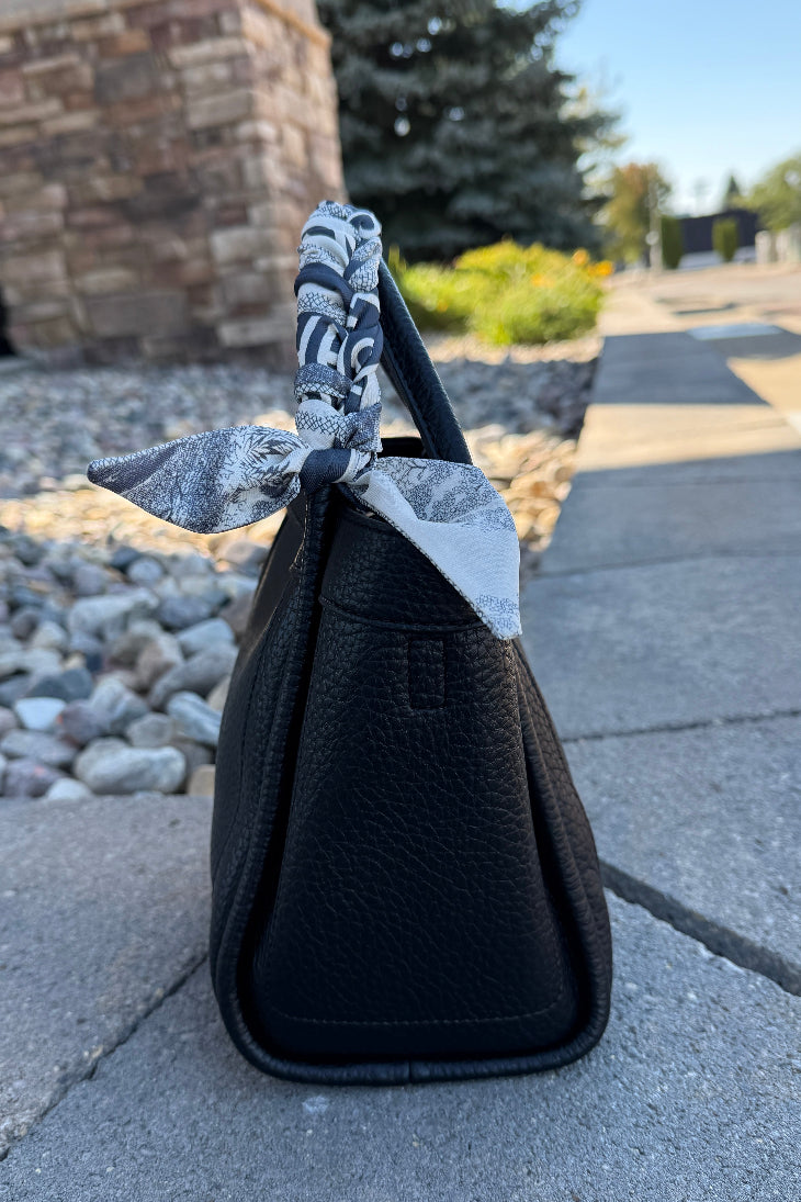 Crafted from pebbled vegan leather and adorned with a fashion scarf on the handle, this tote bag brings a touch of style to everyday looks.